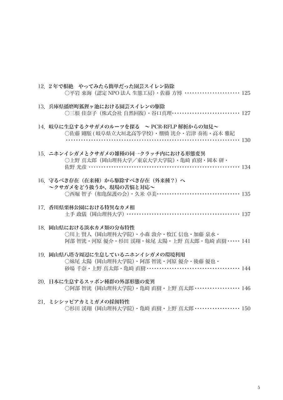 アライグマ対策、園芸スイレン防除、ニホンイシガメ保全など計45題が記載されています。図や写真がついているため内容を理解しやすく、最新の水辺の外来種および淡水ガメに関する全国各地の情報がこの1冊で分かります。